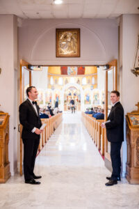 Immersed in the incredible energy and deep traditions of their families, the atmosphere felt delightfully reminiscent of My Big Fat Greek Wedding. By utilizing a discreet, multi-angle cinematic approach—from sweeping balcony perspectives to intimate aisle framing—we ensured the solemn beauty and joyful energy of the moment were preserved flawlessly, without ever interrupting the sacred space.